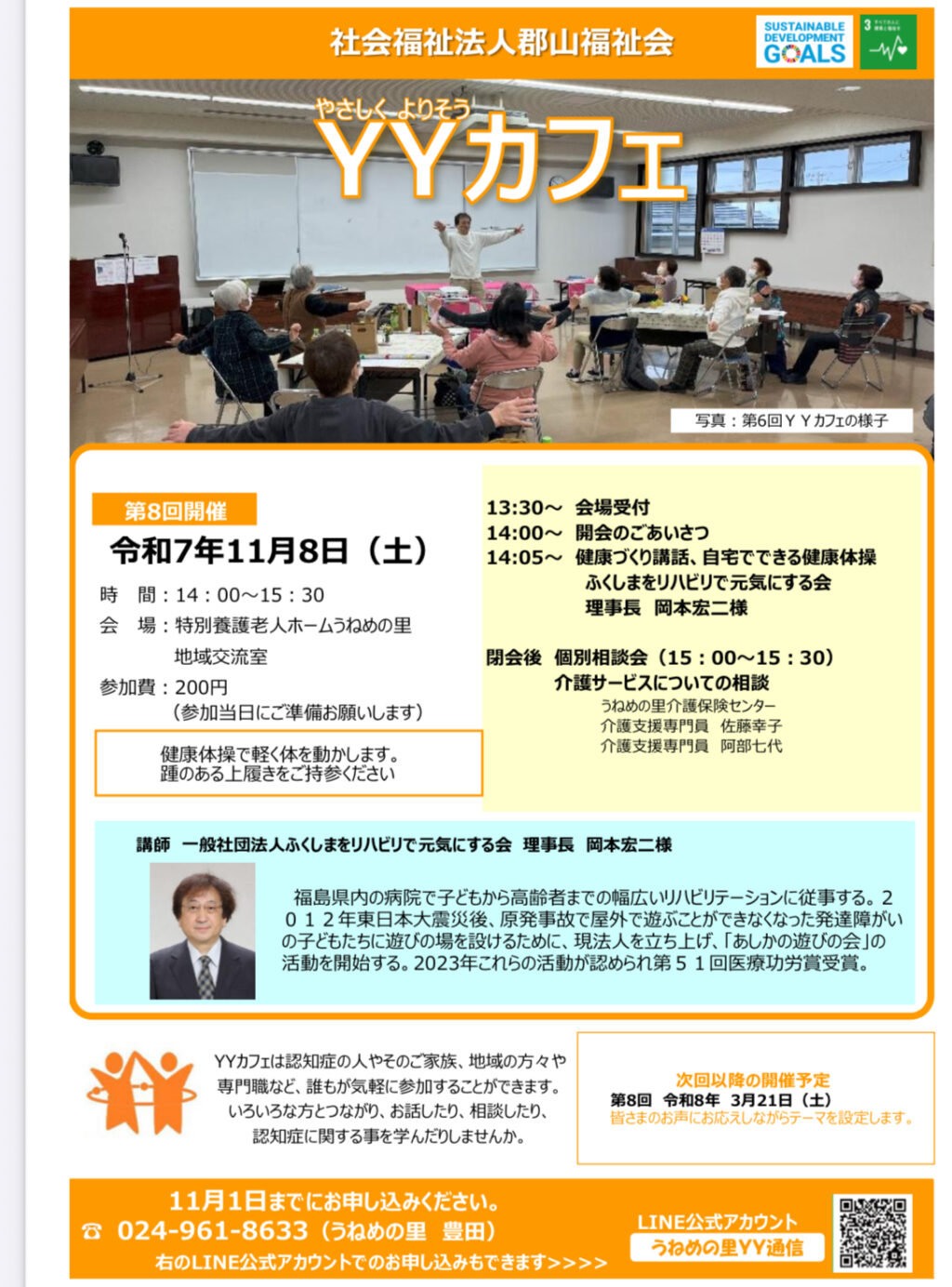 会場は「特別養護老人ホームうねめの里地域交流室」になりますので、是非お気軽にご参加くださいますようご案内申し上げます。