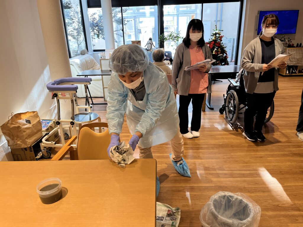 令和7年12月16日 令和7年度第2回感染症発症時における業務継続計画(BCP)訓練・研修を実施しました。 ≪目的≫ 感染症発症時は広がりを最小限にする必要があり、職員自体が媒体となり感染源を持ち運ぶことで感染を広げない・・・