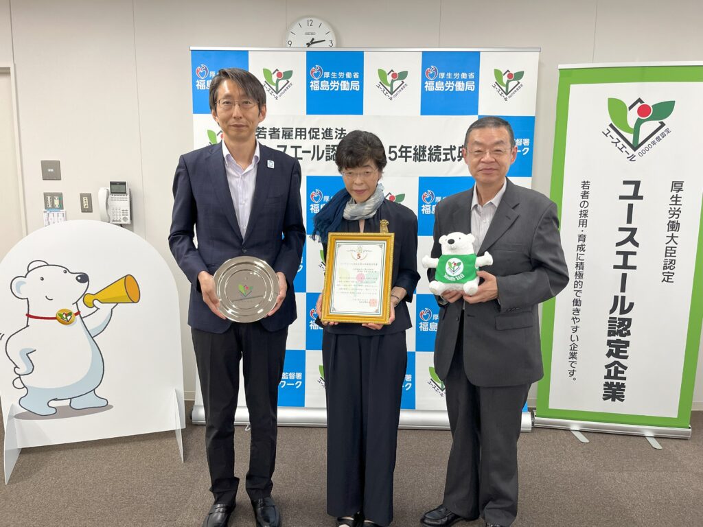 郡山福祉会は「ユースエール」を令和元年に受け、このたび5年継続表彰を拝受しました。 本認証は、若者の採用や育成に積極的で、雇用管理の状況が優良な中小企業を厚生労働大臣が認定する制度です。 これからも、職員同士も互いを尊重・・・