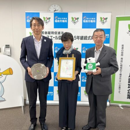 郡山福祉会は福島県次世代育成支援企業「働く女性応援」認証を受け、9月25日に認証状交付式に出席しました。 本認証は、仕事と育児が両立できる職場環境づくりに取り組み、加えて介護との両立や男女が共に働きやすい環境など仕事と生・・・