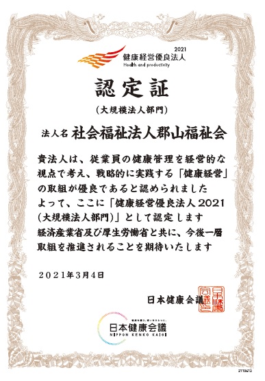 2021年3月4日 社会福祉法人郡山福祉会は、経済産業省が主宰する日本健康会議より≪健康経営優良法人2021(大規模法人部門)≫に認定されました。