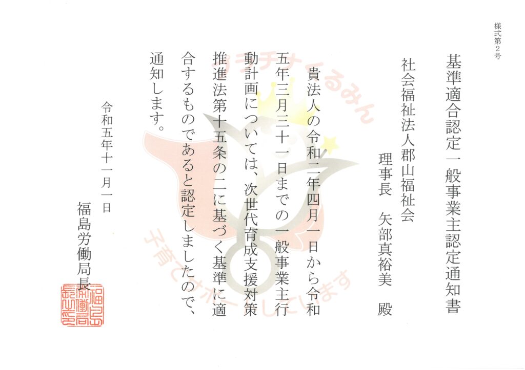 郡山福祉会は次世代育成支援対策推進法に基づき、2020年7月に「子育てサポート企業」として、厚生労働大臣の認定「くるみん」を受けておりましたが、2023年11月22日、より高い水準の取組を行ったとのご評価を賜り、「プラチナくるみん」の認定を拝受いたしました。福島県では6企業(法人)目の認定になります。