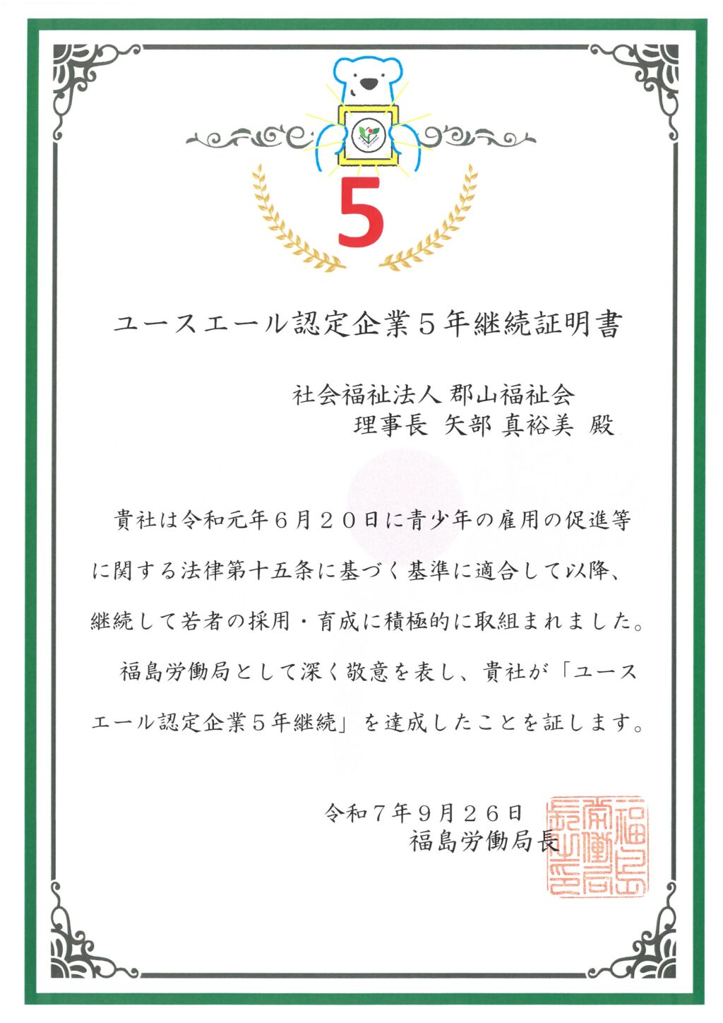 郡山福祉会は「ユースエール」を令和元年に受け、このたび5年継続表彰を拝受しました。