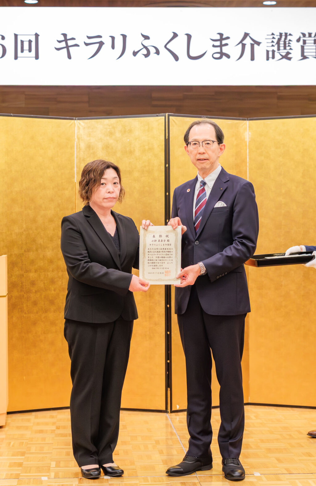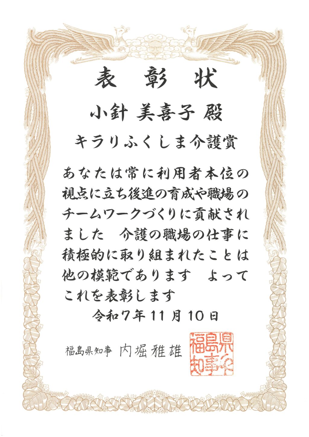 令和7年度<キラリふくしま介護賞>に小針美喜子(うねめの里介護課サブリーダー)が授賞いたしました。