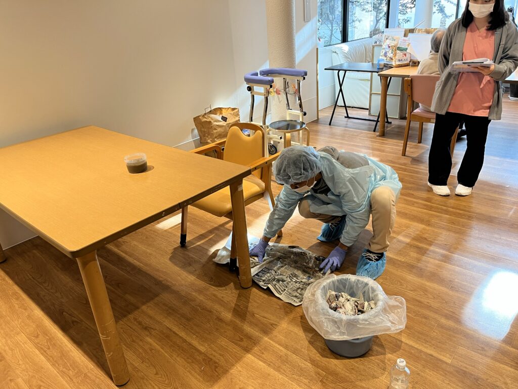 想定:Aユニットの入居者1名がリビングで嘔吐したため、吐物の処理実施