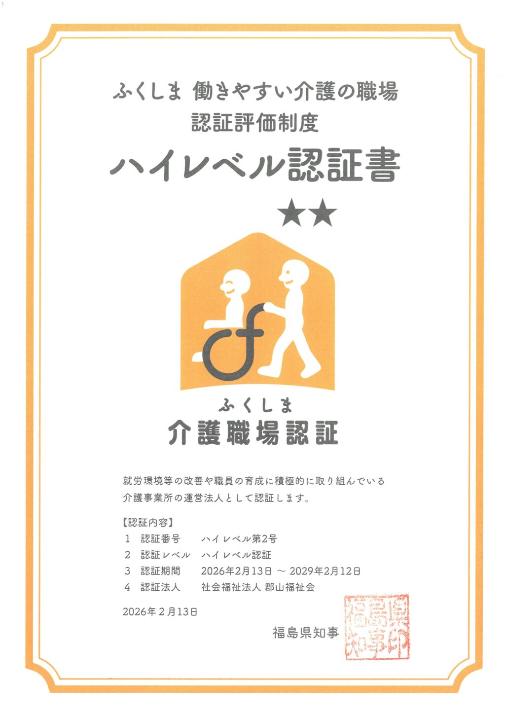 令和8年2月13日 郡山福祉会は「ふくしま介護の職場認証評価制度 ハイレベル認証」を拝受しました。