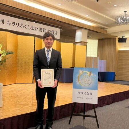 令和6年度<キラリふくしま介護賞>に ★小林大樹(うねめの里はるひめ介護課リーダー)が授賞いたしました。 ★キラリふくしま介護賞は「入居者様に対する思いや対応が優れている」、「新人職員、後輩職員への指導・助・・・