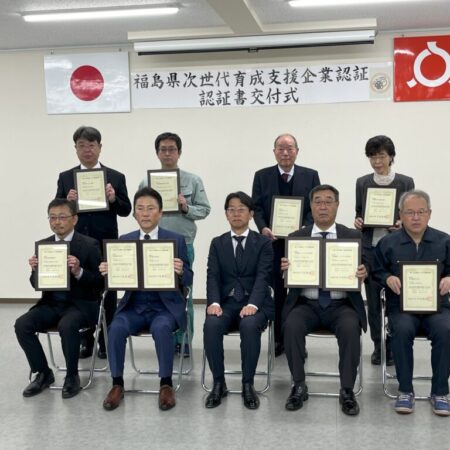 福島県次世代育成支援企業「仕事と生活の調和推進企業」認証を拝受いたしました。 本認証は、(1)基礎項目 法令を遵守し、全ての項目を満たした就業規則等を整備していること (2)評価項目 仕事と生活の両立に関する指標(休業・・・・