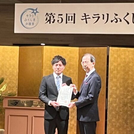 令和6年度<キラリふくしま介護賞>に ★小林大樹(うねめの里はるひめ介護課リーダー)が授賞いたしました。 ★キラリふくしま介護賞は「入居者様に対する思いや対応が優れている」、「新人職員、後輩職員への指導・助・・・